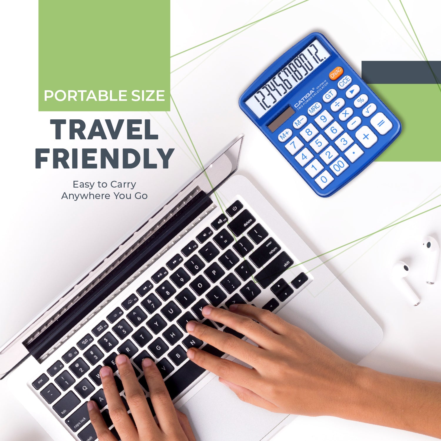 - [FUNCTIONALITIES] - Add, subtract, multiply, divide, backspace, grand total, CE, %, M+/M-/MRC, On/AC Button, and Auto Power-Off. The calculator will turn itself off after about 6 minutes of being idle.